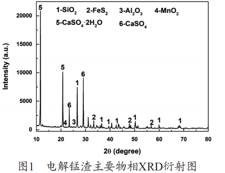 电解锰渣为粉末状固体废弃物,其为黑色细小颗粒,水分含量较多,平均含水量在30% 左右。本文对所选贵州地区电解锰渣中化学成分进行分析测试,发现其主要元素组成为 O、P、K、Ca、Mg、S、Si、Mn、Fe、Na、Al 等,元素分析见表1。电解锰渣化学组成及含量见表2。图1为所选电解锰渣 XRD 检测结果,得出该电解锰渣的主要成分,含有的主要物相为石英(SiO2)、黄铁矿(FeS2)、硫酸钙(CaSO4)、生石膏(CaSO4· 2H2O)、氧化铝以及氧化锰等。