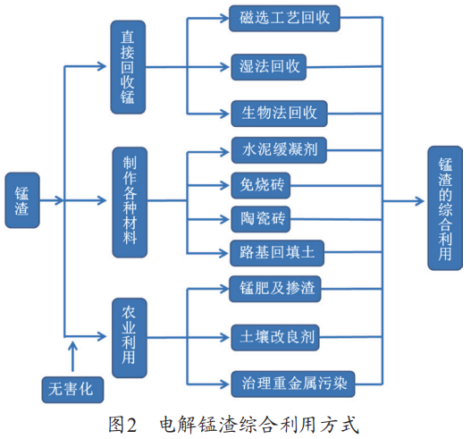 锰渣利用方式见图2,包括从锰渣直接回收各种有价元素 以及利用电解锰渣制备各类工农业材料。