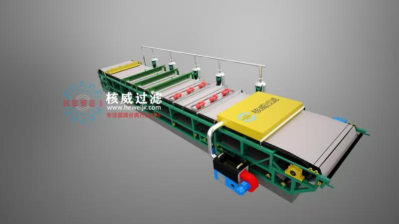 真空带式过滤机以环形过滤带为介质,通过真空系统产生负压实现固液分离,整个过程分为浆料分布、真空过滤、清洗提纯、自动卸料四个连续阶段,完美适配膨润土浆料的处理需求。首先,经提纯或钠化改性后的膨润土浆料通过进料装置均匀分布在运行的过滤带上,进料装置的搅拌机构可防止固体颗粒沉降,避免局部滤层过厚或过薄影响分离效果;随后滤带携带浆料进入真空吸滤区,真空盒产生的-0.04~-0.08MPa负压将浆料中的液体快速抽离,膨润土颗粒被滤带截留形成连续滤饼,通过多段真空室梯度调压,实现前端快速脱水、后端深层脱水的效果;若需提升产品纯度,清洗区的喷淋装置可喷洒清水或专用洗涤剂,去除滤饼表面残留的可溶性杂质,洗涤液单独收集避免交叉污染;最后滤带运行至卸料区,通过卸料辊张力变化和弹性刮刀完成自动卸料,清洁后的滤带循环进入下一轮作业,实现24小时连续运行。